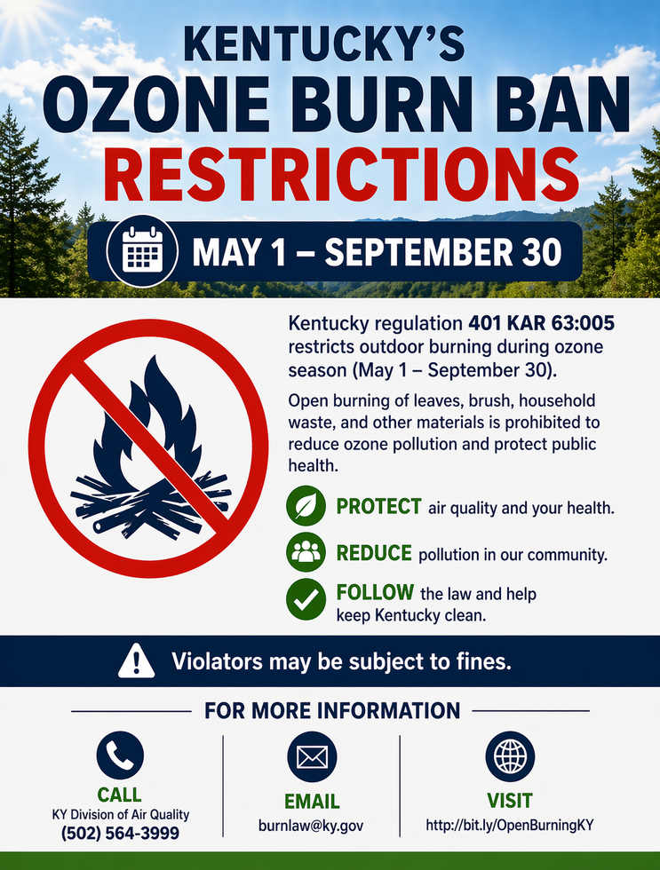 All questions concerning Open Burning should be addressed to the KY Division of Air Quality at 502-564-3999 or via email at burnlaw@ky.gov. Additional information can also be found on the Department of Environmental Protection website at: http://bit.ly/OpenBurningKY
